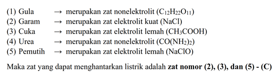 Dari kelompok senyawa tersebut yang termasuk senyawa kovalen yang dapat menghantarkan listrik adalah nomor...